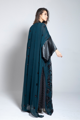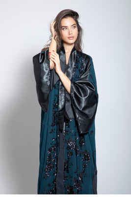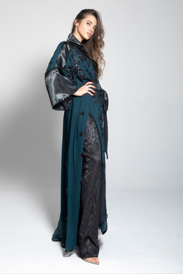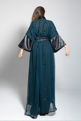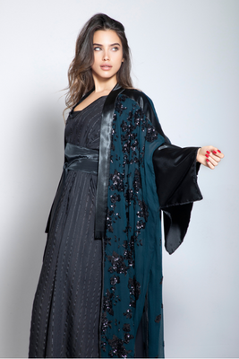 kufttan with black flowery embroidery green lace , comes with  wrapped belt and long dress