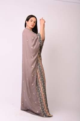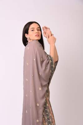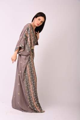 Glam Glow silky going out, embroidered sary kufttan, silk cheffon, shades of earthly colors...
