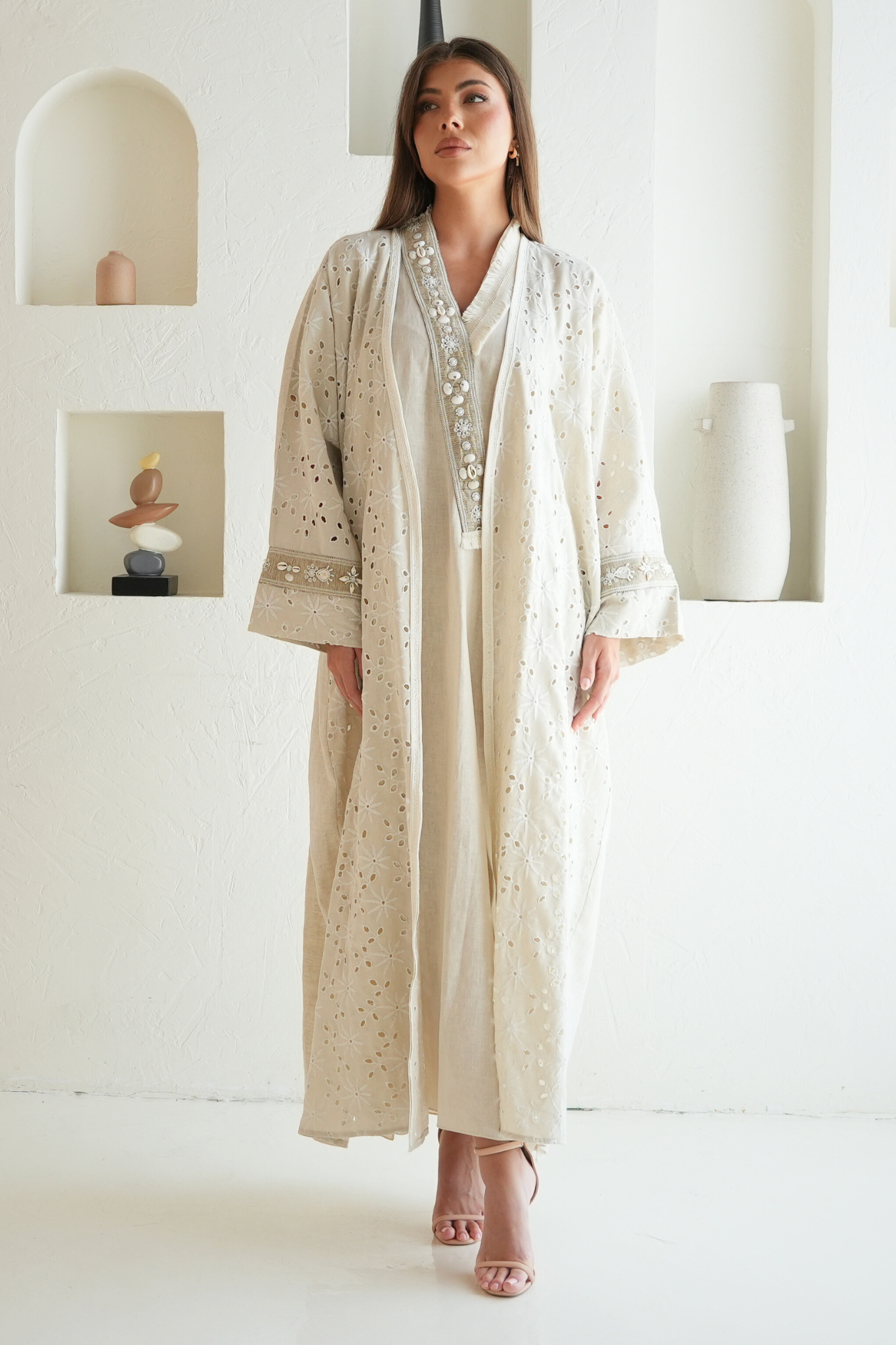 This elegant abaya is crafted from high-quality linen fabric, offering a light and breathable feel perfect for warm weather. It features intricate eyelet embroidery throughout, adding a touch of femininity and sophistication. The wide sleeves and relaxed silhouette provide effortless comfort